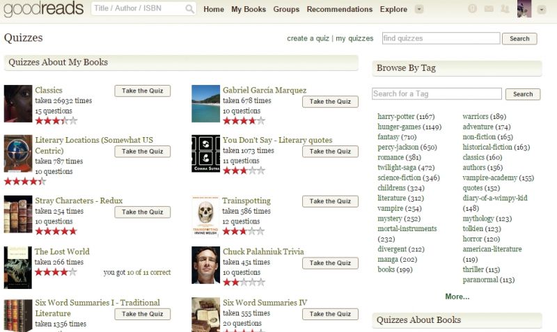 Luând în considerare tagurile, cele mai multe teste sunt pe subiectul Harry Potter (peste o mie). Pe locul doi, care depăsește tot o mie de menționări, se află  chestionarele referitoare la The Hunger Games. Prin urmare, dacă ești fanul înfocat al unuia dintre aceste serii, cu siguranță n-ai cum să te plictisești pe Goodreads.