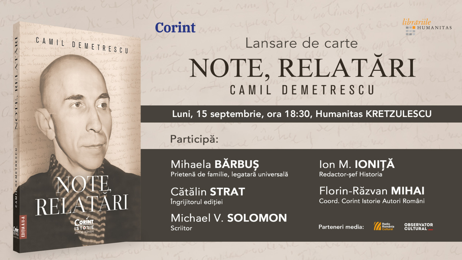 Corint Istorie anunță lansarea volumului „Note, relatări” semnat de Camil Demetrescu, una dintre cele mai importante mărturii memorialistice din istoria diplomației românești a secolului XX. Evenimentul de lansare va avea loc luni, 15 septembrie, de la ora 18:30, pe terasa Humanitas Kretzulescu.