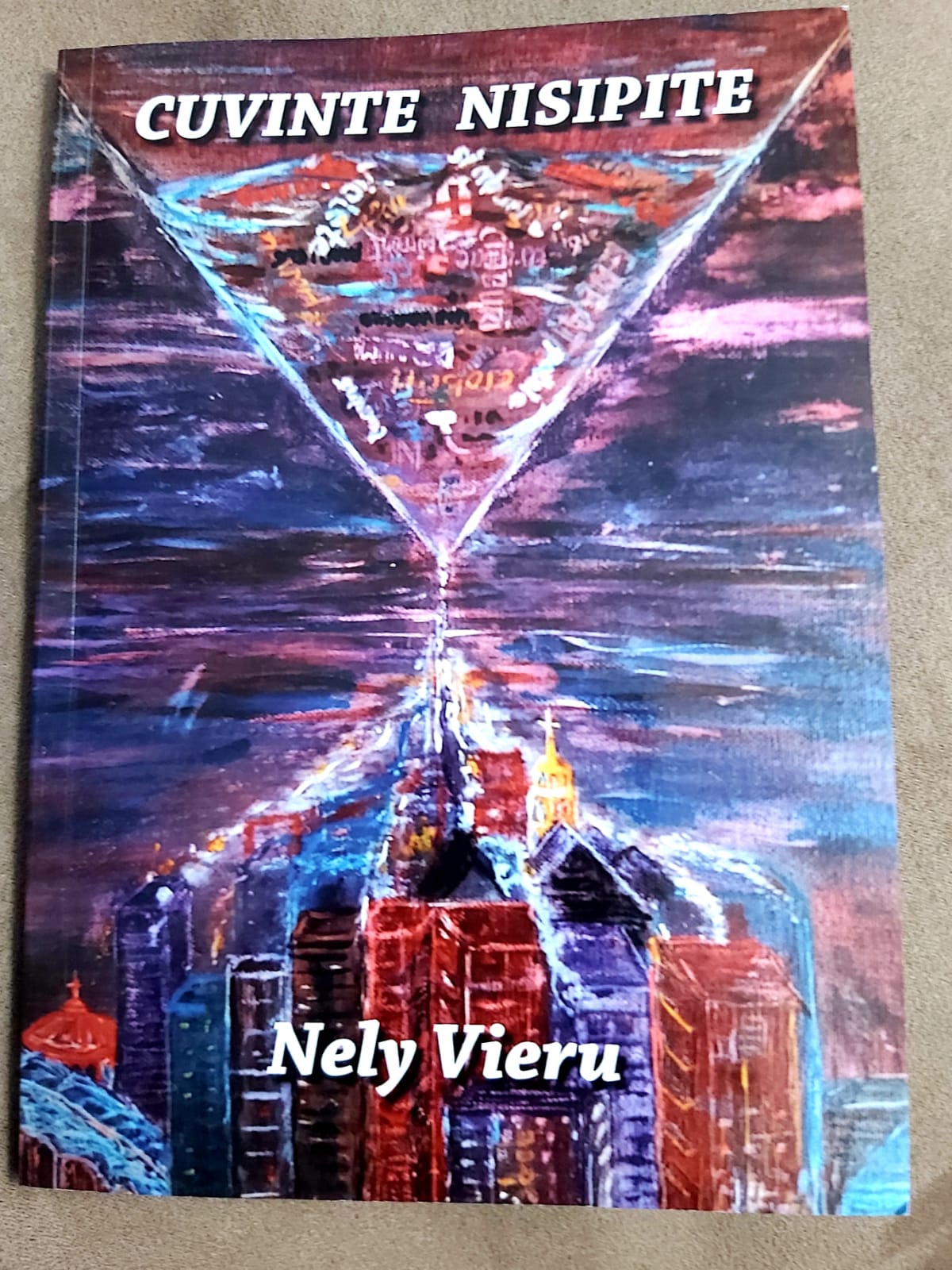De curând am aflat că anul acesta poetul-pictor Nely Vieru a publicat un nou volum liric, intitulat sugestiv, Cuvinte nisipite. Titlul, ca și imaginea de pe copertă (realizată chiar de autor), ne poartă cu gândul la nisipul din clepsidră, la scurgerea timpului. În mod particular, în timp ce cuvintele se sedimentează, idei noi noi se modelează. În imaginea expresivă observăm, în partea superioară a clepsidrei o zonă neclară, amestecul inițial în formă brută, iar la bază distingem o lume nouă cu forme bine delimitate, un contur deslușit.